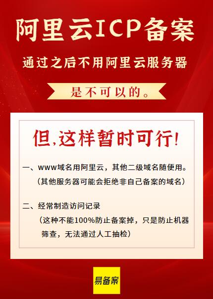 也就是說理論上,你在阿里云進(jìn)行備案,就應(yīng)該使用阿里云的服務(wù)器。但也不是說完全就沒有其他辦法。各種辦法也各自有風(fēng)險。