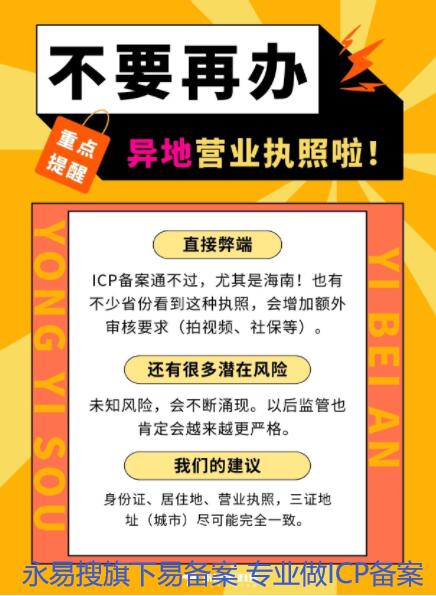 這次蒙混過(guò)關(guān)了,等后邊備案被取消再進(jìn)行備案的時(shí)候,是否一定能通過(guò)呢?辦理其他業(yè)務(wù)是否順暢呢?很不好說(shuō)。所以我們是建議大家,辦理自己本地的營(yíng)業(yè)執(zhí)照,之后所有的業(yè)務(wù)都通順了……